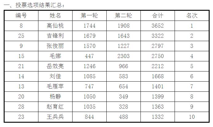 經過2016-02-01 00:00到2016-02-07 23:59的第一輪投票和2016-02-13 00:00到2016-02-23 18:00的第二輪投票,我校的好教師網絡投票活動已經結束。現將結果統計如下:
